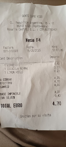 Worst experience in Vigo. Hospitality was poor, after waiting 15 minutes for the waitress to a acknowledge us, she was rude . We said hello and she said madre mía looking at my niece. We ordered 3 cortados and sparkly water she took the order and when she was at the bar she just shouted that there are no coffee service without an apology and no asking if we wanted alternative. Other tables had coffee so they refiused to serve coffee to us for no reason but we could see people drinking coffee there. Poor service and unprofessional. We went to the cafetería across the Road because at Quento we received...