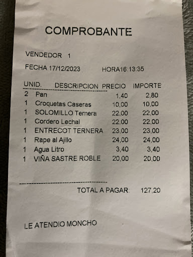 Read morePrecio adecuado al producto. Comida exquisita, camarero correctísimo y atento. Pero nos sentemos a las 14:30 y a las 18:00 (no exagero en absoluto) estábamos acabando los cafés. Empezaron a servirnos a las 15:15 y los entrantes "calientes" (calamares p.ej) llegaron fríos, entre platos tardaban un mínimo de 20 min desde que les avisábamos (el camarero no conseguía atender todo el restaurante con su compañero y teníamos que avisarles para que no tardasen más). Es una pena que un restaurante de tan buen genero, precio tan apropiado y personal tan bien formado estropee totalmente su servicio por cuestiones como está. Quiero pensar que fue el día que les faltó un (o dos) camareros de forma no prevista. La única razón por la que no nos marchamos fue que éramos 14 (y dos niñas), sería complicado a esas horas encontrar otro sitio y había personas mayores con dificultades...