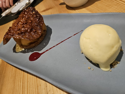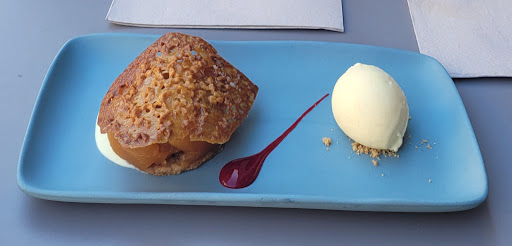 De cierre, un tatín de manzana y helado, bien presentado y muy rico, la manzana bien asada con una base de galleta y cubierto con una especie de coca muy rica y un helado bien atemperado, con un dulzor en el punto.