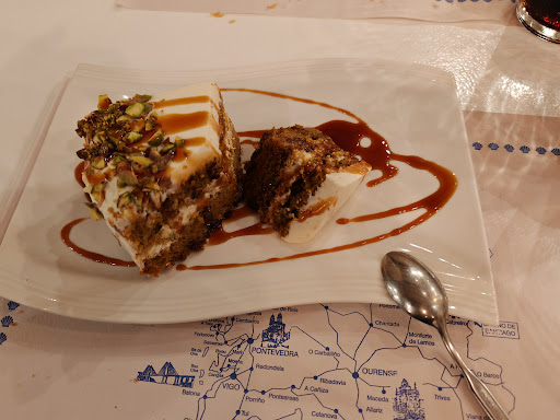 Read moreSomos tres parejas que vivimos en Cangas y vamos encantados siempre que podemos ya que la comida, el servicio, y el ambiente son de 10! Flore (o Floren) perdón por no recordar bien el nombre es el camarero que nos ha tocado las veces que hemos ido a comer. Es un chico muy majo, atento y servicial, siempre dado a ayudarnos con la elección de la comida y a que nos llevemos el mejor sabor de boca. Ibamos con una idea preconcebida de lo que íbamos a pedir, pero al final gracias a sus sugerencias que había fuera de carta (por cierto, todo riquísimo) nos inclinamos por pedir todo lo novedoso de hoy y dos platos que nunca fallan, los calamares y las milanesas de pollo. La ternera con salsa de mostaza y demás riquísima, carne al punto, salsa deliciosa, el raxo y el secreto con salsa de tetilla, todo brutal. Y ya de último los postres, la tarta de zanahoria que siempre triunfa, el lemon pie que estaba exquisito ( repetimos postre) y la tarta de 3 chocolates. Nunca nos defrauda, además la calidad de la comida, la cantidad ( abundante ) y el trato excepcional de nuestro camarero hacen que siempre sea un sitio al que queremos volver siempre que tenemos algo que celebrar. Espero que siga así siempre, ya que hoy en día es una seña de identidad en la que muchos nos fijamos. Calidad precio lo mejor, y sin tener que gastarse un dineral y nunca, nunca saldrás de allí con...