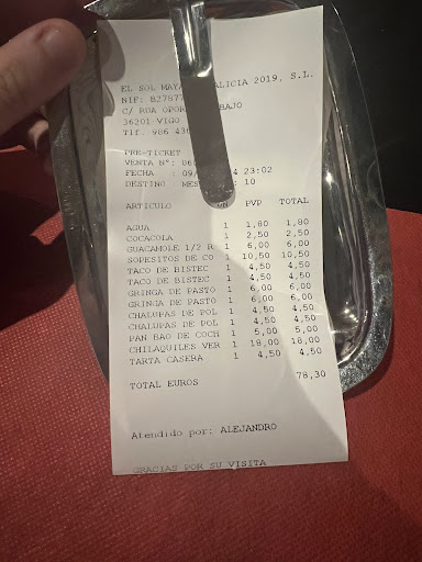 Read morePedimos guacamole, dos quesadillas y dos gringas. El queso de las quesadillas estaba en mal estado y tras avisar al camarero con todo nuestro respeto, educación y discreción (he de decir que el camarero fue muy educado y amable), el encargado se acercó para decirnos de malas formas, sarcásticamente y señalando al resto de mesas, que era el mismo queso que estaban comiendo todos. Le explicamos amablemente que el queso de los entrantes era el que no estaba bien y al decirle que el segundo si estaba bueno, nos dijo con mofa que se quedaba con eso y se fue. No recibimos ninguna disculpa ni ninguna otra opción (la quesadilla se quedó entera), tampoco volvieron a acercarse a la mesa a retirar los platos, ni preguntar si queríamos algo más. Tuvimos que ser nosotras las que nos levantamos a pagar a la barra. El chilam balam era de nuestros restaurantes favoritos pero obviamente en Sol Maya ni el producto ni el servicio están a la altura. Quizás por eso un viernes noche estaba medio vacío. Ahora lo entendemos.