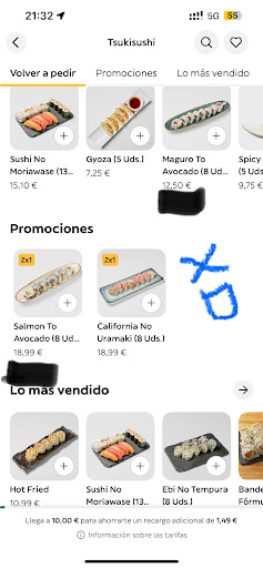Es realmente gracioso cuando abro Glovo y veo en una misma pantalla “volver a pedir: maguro to avocado (8ud): 12,5€” (lo que generalmente cuesta) Y justo en la línea de abajo: “Promoción 2X1 salmon to avocado (8 Ud)”: 18,99€. (Cuando generalmente suele costar 1 o 2€ menos que el maguro to avocado).