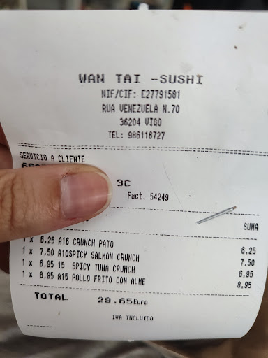 I made an order through just eat. The order came pretty fast. I've been looking for a good place with great sushi in Vigo for a while. And i've decided to give it a try. So I ordered MENU 3: 4 MAKI DE SALMON, 4 SALMON ROLL, 4 SESAMO ROLL, ARROZ+ Goyza empanadilla rellena de carne( they were a little bit oily). Rolls were fresh and delicious! Rice portion was big enough. In general i am very pleased with the quality and taste! Will deffo be ordering more! One inconvenience is the minimum...