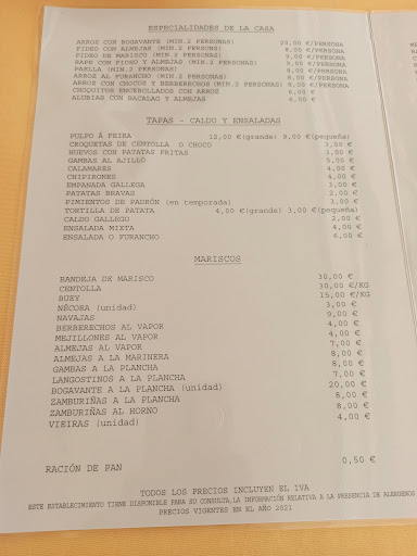 Nosotros solemos coger almejas a la marinera (espectacular), pulpo, croquetas de choco, navajas, zamburiñas, gambas al ajillo, Vieira rellena, tarta de queso al horno y tarta de queso fría.