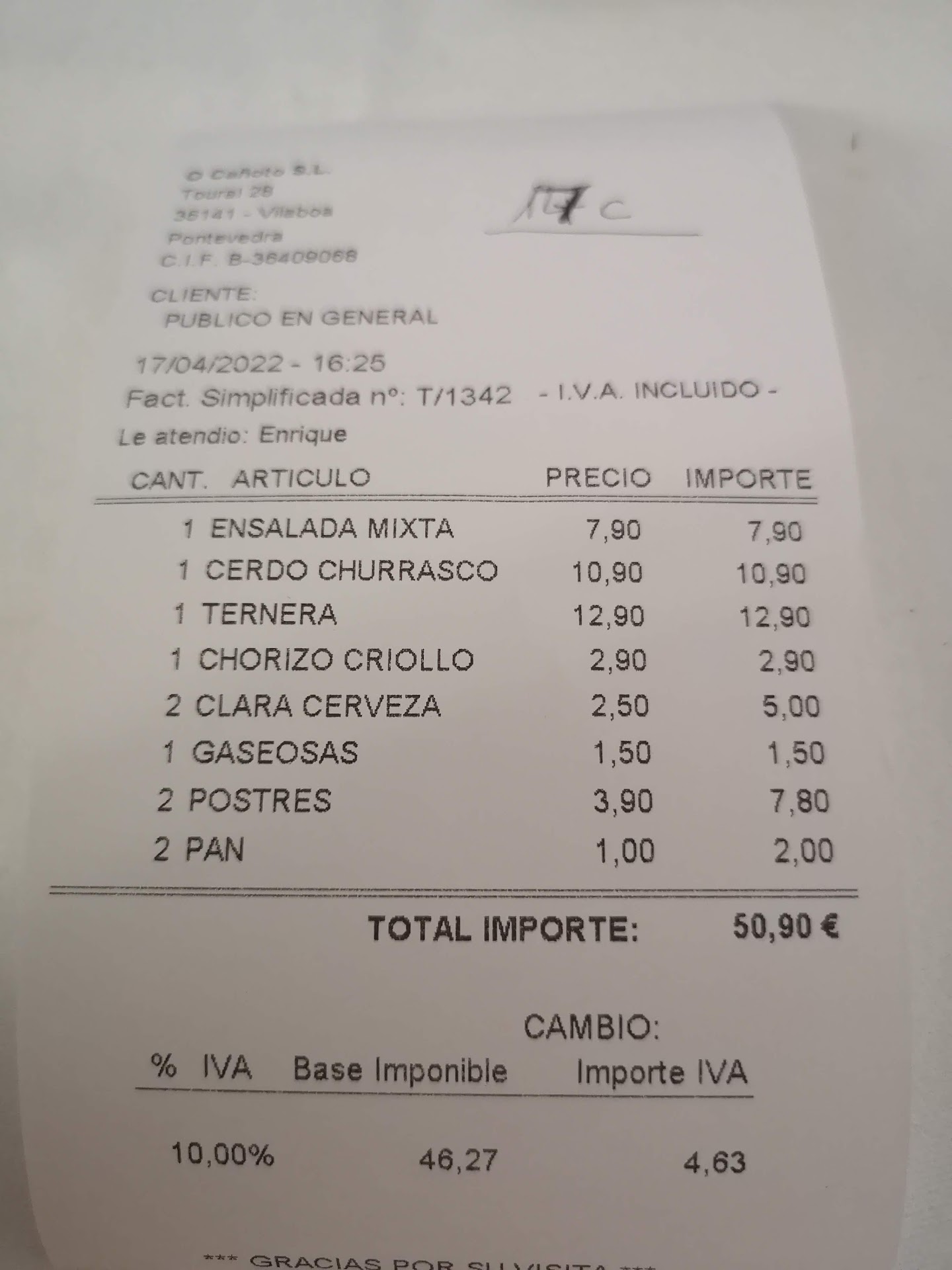 La comida escasa, carisima y el personal bastante desagradable, ademas de tardar un monton en servir la comida. No volvere. Dicho esto y respondiendo a tu mala educacion y pesima relaciones publicas de tu local, te dire que eramos 5 adultos y una niña , pedimos, 2 de pimientos de padron, una ensalada, 5 raciones de churrasco , 4 chorizos criollos y un chorizo casero. Bebimos 2 botellas de agua grandes, 2 cocacolas y un vino de la casa con gaseosa. Pedimos 2 raciones de pan, que efectivamente, se especifica en la carta que es a 1.20€ . Nos trajeron 2 cestos con pan. Mi sorpresa es que el 1.20 era por cada pedazo de pan!!! Obviamente proteste, fuera como fuese, yo habia pedido 2 de pan...yo no tengo porque saber que 1 de pan no es un cesto de pan, si no un trozo de pan!!!!!Pagamos 113 euros. La comida llego tarde, escasa, sí que estaba buena, pero todos salimos con ganas de haber comido mas y la sensacion de haber sido atracados..... Lo peor y de donde viene mi reseña negativa? Son unos autenticos maleducados, gente tan miserable y que trata a sus clientes con este desprecio no se merece que su negocio que depende de nosotros, le vaya bien. En esta factura que adjunto, ya esta modificado el precio del pan, ya que me devolvieron lo que habiamos pagado de mas teniendo en cuenta que nosotros solo habiamos pedido 2 de pan, aunque la dueña aun se encaro con nosotros diciendo que reclamabamos pero nos lo habiamos comido...increible, me lo como porque lo he pagado, los que habeis puesto en mi mesa algo que yo no habia pedido, fuisteis vosotros..