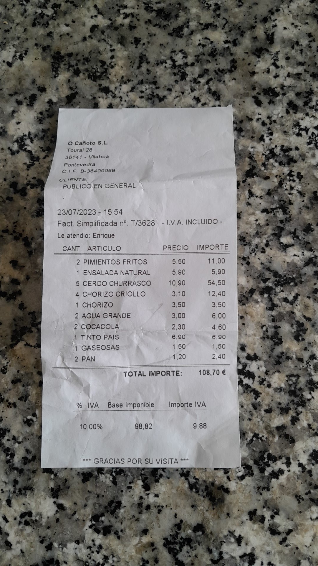 La comida escasa, carisima y el personal bastante desagradable, ademas de tardar un monton en servir la comida. No volvere. Dicho esto y respondiendo a tu mala educacion y pesima relaciones publicas de tu local, te dire que eramos 5 adultos y una niña , pedimos, 2 de pimientos de padron, una ensalada, 5 raciones de churrasco , 4 chorizos criollos y un chorizo casero. Bebimos 2 botellas de agua grandes, 2 cocacolas y un vino de la casa con gaseosa. Pedimos 2 raciones de pan, que efectivamente, se especifica en la carta que es a 1.20€ . Nos trajeron 2 cestos con pan. Mi sorpresa es que el 1.20 era por cada pedazo de pan!!! Obviamente proteste, fuera como fuese, yo habia pedido 2 de pan...yo no tengo porque saber que 1 de pan no es un cesto de pan, si no un trozo de pan!!!!!Pagamos 113 euros. La comida llego tarde, escasa, sí que estaba buena, pero todos salimos con ganas de haber comido mas y la sensacion de haber sido atracados..... Lo peor y de donde viene mi reseña negativa? Son unos autenticos maleducados, gente tan miserable y que trata a sus clientes con este desprecio no se merece que su negocio que depende de nosotros, le vaya bien. En esta factura que adjunto, ya esta modificado el precio del pan, ya que me devolvieron lo que habiamos pagado de mas teniendo en cuenta que nosotros solo habiamos pedido 2 de pan, aunque la dueña aun se encaro con nosotros diciendo que reclamabamos pero nos lo habiamos comido...increible, me lo como porque lo he pagado, los que habeis puesto en mi mesa algo que yo no habia pedido, fuisteis vosotros..