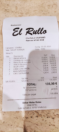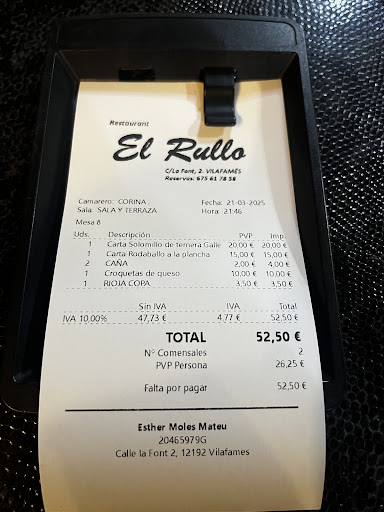 Mensaje para Esther (no pudimos conocerla en persona, lástima): eres una pedazo de profesional y por atenciones personalizadas como la tuya es por lo que se ganan clientes de por vida. Eternamente agradecido por complacerme en todo cuanto pudiste y por responderme cada mensaje, siempre que tenías un momento. Y ahora mensaje para el resto de Restaurantes de España que "cojean" en atención al cliente: por favor tomen nota de cómo debe ser tratado cada cliente... El Rullo es vuestro ejemplo!