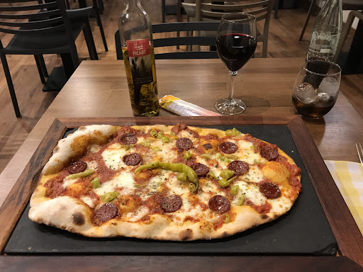 Excelente, posiblemente la mejor pizzerias de Vilanova hasta la fecha. Tenemos una selección de pizzas, que podríamos llamar "clasicas" y otra selección mayormente elaboradas ( en ambos casos, excelente ejecución de las mismas ). Pero no solo sirven pizza, se pude degustar una variada selección de entrantes, así como risottos, los cuales, tenian el punto perfecto y un potente sabor ( atención si eres amante del queso al de gorgonzola con espinacas ). Me faltaron probar las hamburguesas ( así como otras cosas, claro ;) , parecían tener muy buena pinta, veremos en otra ocasion :) . El lugar es agradable, un espacio aceptable entre las mesas, con detalles ( la carta a modo de periódico tiene un punto divertido :) ). La atención por parte del personal, fue muy amable y correcta. El servicio de los platos rápido. Quizas lo único discordante ( que no tiene porque ser un fallo, es mas una apreciación personal ) , es la retirada de los mismos, según acababa la gente, se iban retirando los platos, provocando una sensación de "prisa" al resto de comensales que se lo tomaban con mas calma. Como digo, no tiene porque ser un fallo. La camarera que atendió nuestra mesa fue muy amable y atenta. Muy recomendable, sitio agradable, buen trato y una muy buena carta y elaboración de la misma. Sugerencia, intentad reservar mesa!! Excellent, possibly the best pizzerias in Vilanova to date. We have a selection of pizzas, which we could call "classic" and another selection mostly elaborated (in both cases, excellent execution of them). But not only serve pizza, you could taste a varied selection of starters, as well as risottos, which, had the perfect point and a powerful flavor (attention if you're a cheese lover with gorgonzola with spinach). I had to try the burgers (as well as other things, of course;), they seemed to look very good, we'll see in another occasion :). The place is nice, an acceptable space between the tables, with details (the letter as a newspaper has a funny point :)). The attention from the staff was very kind and correct. The service of the dishes fast. Perhaps the only discordant (which does not have to be a failure, it is more a personal appreciation), is the withdrawal of the same, as people ended, the dishes were removed, causing a sense of "haste" to other guests they took it more calmly. As I say, it does not have to be a failure. The waitress who attended our table was very friendly and attentive. Highly recommended, pleasant site, good treatment and a very good letter and elaboration of it. Suggestion, try to reserve a table !!