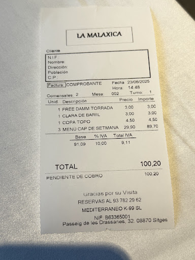 I am very fortunate to eat here for 2 days in a row. I arrived the day before the lock down since I haven't been able to go round the town little did I know most local restaurants do not accept table for one. Having been turn away by several restaurants at La Rambla I am super grateful and happy to find La Malaxica. When you were hungry not able to speak in Spanish and no restaurants wanted to feed you just because I was alone and not worth their time it was so low morally. Anyway the food from the Chef's cooking was spot on on both occasions, great consistency and delicious. Service staffs from yesterday and today were both courteous and super friendly and helpful. Great value for money. Top quality. Thank you so much for your hospitality,...
