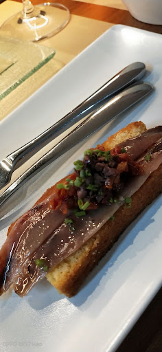 Read moreDecía el maestro de Poble Sec que "de vez en cuando la vida toma conmigo café y es tan bonita que da gusto verla, se suelta el pelo y me invita a salir con ella a escena". Y es que un poquito de esto es lo que Vilanova hizo conmigo. De vez en cuando te sorprende, subyuga y hasta te ofrece una vida extra en forma de placer culinario. Entiendo al fotógrafo que se dedica a captar momentos de esas maravillas de la evolución que pasean ante él y quizá hagan algo que jamás volverán a reproducir en su vida y que para ello deben estar horas, días, semanas o meses escondido, en lugares no aptos para la subsistencia humana, buscando ese subidón de adrenalina. Aprecias que el lugar promete nada más pedir la reserva: para una hora después solo queda lugar en la barra, taburetes mediante. Local en pleno casco antiguo, de reciente remozado. Llama la atención la (aparente) no muy extensa carta de platos, pero luego, una vez le dedicas 5 minutos, aprecias que en realidad hay de todo y que tampoco necesitarás mucho más. Primera visita por lo que optamos por platos no muy "exigidos" y que se suelen encontrar en cartas de nuestra variada cocina: anchoas del cantábrico, bravas, oreja de cerdo crujiente y tartar de lomo bajo madurado. Y comenzó el espectáculo. Las bravas, algo tan típico como denigrado plato español, estaban terriblemente ricas, cremosas y con ese punto canalla-crujiente-picante que les daba un caché delicioso. El tartar, mezclado con yema de huevo, cremoso y finamente picado para adaptar esa melosidad al paladar y que pasaba sin necesidad de contraseña. Con las anchoas tengo un resquemor, un reconcome, un quítame allí un aquél, hasta un regomello... No me gustó la base de las mismas. Vienen servidas sobre un tipo de bizcocho muy tierno y que le aporta un toque dulzón que no me acabó de convencer. Eso sí, la anchoa buenísima. Seré yo que perdí hace tiempo ese punto aventurero. Dejo para el último lugar el plato, en mi opinión, de la noche. Loas, algaradas, vivas y ofrendas a cualquier deidad que deseen a la oreja de cerdo con 12 horas de cocción, en apariencia reseca, sin vida y candidata a cuidados intensivos, pero que cuando cruje y suelta su cremosidad en boca notas que algo ha bajado desde los cielos porcinos para que te entregues a semejante divinidad. Regamos la velada con un Pedrabona (Priorat) que estaba realmente escandaloso. Por favor, permítanme mencionar su amplia carta de vinos dedicada para todos los gustos. Los más exigentes paladares o bolsillos más delicados encontrarán cabida en su variedad de zonas geográficas o tipos de uva ya sea la elección de blancos o tintos que fueron, principalmente, los que centraron mi atención. De postre una torrija de brioche con vainilla caramelizada y helado de avellanas. Todo esto a la vista de 3 cocineros que en un ir y venir sin parar no dejaban de cocinar, aderezar, preparar y ultimar platos y más platos. carnes a la brasa de variedad nacional con meses de maduración o pescados que tenían un aspecto demoledor. Esto último, sin duda, quedará para una futura visita que no tardaremos en concretar. Relación calidad-precio espectacular. Debemos pensar que se sirve calidad, un alto nivel culinario y una presentación acorde con lo que se ve y trabaja. Y esas cosas hay que pagarlas. Si no acuden al menos una vez les subirá el IBI. Avisados (y...