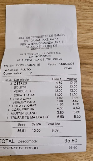 And i shall not be disappointed, rustic but personal and very friendly service explaining the menu (written in Catalan and Spanish)… I ordered across the menu, fresh ingredients prepared behind the bar. Meat, fish, seafood, veggies… all of it fresh and very tasty and served right upon preparation. A little surprise was him using a delicious Kalamata olive oil… didn’t expect that one in proud Iberia, but...