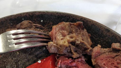 Nada del otro mundo. Primero cobran por el pan (de barra normal con el buen pan que hay por la zona, ese no lo es) 3 trozos sin cesta ni nada, puestos sobre la mesa que tiene manteles individuales de papel, pues esos 3 trozos 2,50 eur. La barra vale 1 eur. El camarero nos mete prisa para pedir porque hay una mesa de 10 personas que como pida luego tenéis que esperar. Pues no sé porqué tanta prisa, la verdad. Todas las mesas que pedimos la comida salió casi al momento, sospecho y luego me reafirmo que se calienta y sale. En nuestro caso, croquetas de botillo, a la mesa en 3 minutos y completamente congeladas en el interior. Como lo solucionan? Al microondas y vuelven convertidas en lava volcánica... Aún un poco congelada. Decepción máxima. Lo único reseñable fue la carne. Muy bueno el entrecot y los escalopines. El menú infantil técnicamente viene con postre y bebida pero la botella de agua nos la cobraron entera. En fin que más de 50 eur por esa comida me parece una barbaridad. El menú de fin de semana sale por 14 eur pero no tenía mucho atractivo. No...