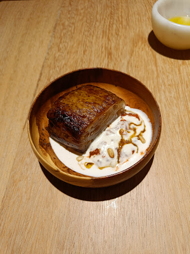 🥕 No hay menú degustación cerrado: se elige a la carta, se comparte, se conversa. La recomendación: tres o cuatro platos y cerrar con su kare raisu, curry japonés reinterpretado con maíz, arroz negro y tortillas mexicanas. Antes, puerros confitados, mole y tortilla crujiente; zanahorias especiadas y lactofermentadas con holandesa y mostaza encurtida; apionabo con mantequilla fermentada, queso pasiego y salsa coreana; o crema de maíz con hueva, padrón, trufa y mantou casero. Cocina de memoria gustativa, técnica precisa y producto ecológico local —a menudo de huertas cántabras y colectivos como AMPROS.