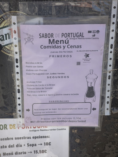 Read moreEs un portugués que está bien para parar y comer porque no te sales de la autovía, está en la vía de servicio. Buena localización. El decorado es de un típico bar con toques portugueses, detalles en los manteles, accesorios de ellos (cataplanas y demás expuestas). El personal muy amable, nos explicaron que con un día de antelación se pueden encargar cataplanas de varios sabores y rodizios de carne o pescado, cosas que de haber sabido hubiéramos hecho sin dudar. El menú está por 15'50€, nuestra experiencia de hoy ha sido regular, hemos pedido balacao a bras (exquisito) una pasta que supuestamente era pasta con setas, y eran macarrones a la boloñesa con tres láminas de champiñón, de segundo las sardinas exquisitas 4 piezas con patatas al estilo portugués que estaban ricas, y chuleta de cordero a la brasa, escasa, pequeña, te quedas con hambre con el menú y más cuando al pedir los postres nos han dicho que "no tenían nada casero porque ayer se les acabaron" asique era fruta o café. Me voy con un sabor amargo y decepcionada, pero bueno le daremos una segunda oportunidad pero reservando un día antes un rodizio...