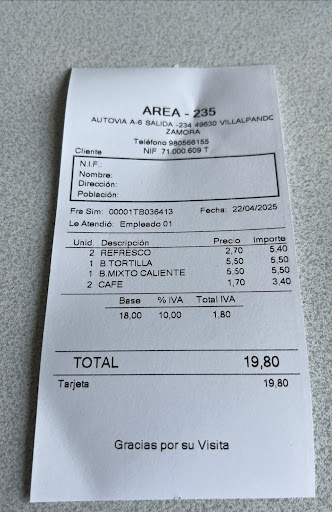 Read moreMi experiencia ha sido la siguiente. Vas por la autovia de la Coruña a las 2 de la tarde un dia laborable de mediados de agosto, a lo lejos ves de frente un restaurante con un cartel gigante que pone menu del dia. Te paras, aparcas, te sientas y te traen una carta. Miras precios y casi todos platos combinados que oscilan entre 15 y 30 € bocadillos y raciones con precios elevados y piensas uf como pica, miras lo que hay en los platos alrededor y son platos nornales algo de carne patatas y ensalada. Piensas esto no es nornal. Viene la camarera muy amable y le pregunto perdone y el menú no me ha traido lo que hay a lo que me contesta anablemente que no hacen menú porque no tienen personal. Le doy las gracias me levanto y me voy al siguente pueblo la Bañeza donde por 13€ me como un menú riquisimo y super variado que casi ni me lo acabo. Esta simplemente es una experiencia puntual no se si en otras ocasiones habrá nenú y cocinan bién. Pero te aseguro que si nos hubieramos quedado nos hubieramos gastado minimo 30€ por persona para comer un...