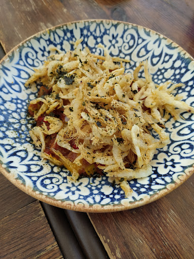 Fuimos con gran ilusión a este restaurante desplazandonos más de 60km pedimos tres platos una ensaladilla de anchoa muy normalita. Ensalada de atún con vinagreta de piparras cuando nos la sirvieron le dije que estaba muy picante y el jefe de sala riéndose me dijo que era la piparras y como le dije que la vinagreta no lleva trozos casi enteros de un cm y una cantidad excesiva mi pareja opino igual que yo. Los raviolits buenos. Una pena ir con tanta ilusión y salir enfadado. Una y no más. Se comió el atún y poco más porque las algas pocas poquitas en la foto no se ve el plato entero. Entonces lo que dijiste de que habían cambiado el suministrador de piparras ya no vale. Lo vuelvo a decir os pasaste con la piparras. Y que llevéis mucho tiempo con ese plato no quiere decir que con el mío os equivocaras. Tal como llegó el plato que no era de mi agrado y en vez de retirarlo te reíste en mi cara. Ahora te dejo una estrella y fui desde Puerto real el mismo sitio en el que estudiaste. Pd. Dile a tu cocinero que una vinagreta no son trozos de mas de un cm. Y a ti un poco más de humildad y reconocer el error y por cierto cuando cocina llamé porque ha salido un plato y llama 3 veces al camarero es muy feo que esté los camareros discutiendo quien lo lleva. Y ya paro...