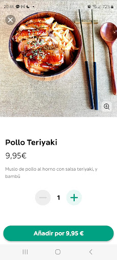 Ayer me apetecía cenar un plato sin demasiados hidratos, así que teniendo en cuenta la foto y descripción del plato, elegí pollo Teriyaki (muslo de pollo al horno con salsa teriyaki y bambú). Adjunto foto.