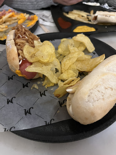 Se pide en barra, algo que a mi entender ¡NO ESTÁ PERMITIDO!, y la gente que come dentro (donde tampoco se desinfectan las mesas) tiene que aguantar a las 20 personas que hacen cola junto a ellas. Encima la única carta disponible está en la caja, donde tienes que elegir rápidamente o tomarte tu tiempo y seguir acumulando gente detrás tuya. La media de edad de los clientes, es bastante baja, y no sé si eso influye en que vayan todos juntos a pedir aunque sean del mismo grupo, con las mascarillas bajadas o la nariz al aire, y muchas veces incluso sin mascarilla. El personal no se preocupa por eso, ni por la distancia ni por nada...