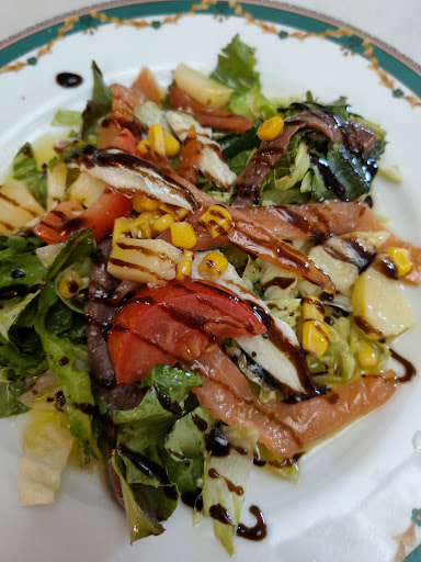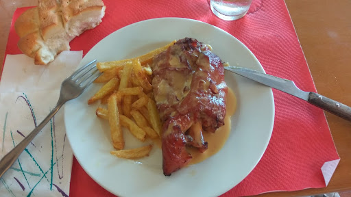 Llegamos allí un domingo de casualidad, ya que veníamos de hacer una ruta de senderismo y visitar algún pueblo de la zona. Al volver de Tiedra hacia Valladolid (allí pensábamos comer), y cruzar Villardefrades dirección a la A6, vimos el restaurante y nos pareció un buen sitio. Principalmente, porque había bastante gente de la zona en la terraza tomando el vermouth y pinchos, y si en un sitio hay gente....por algo será. Entré a preguntar (mi mujer quería pescado sí o sí), y el camarero me atendió muy bien. Me condujo hasta el comedor (amplio, espacioso, limpio y fresquito...fuera hacía mucho calor), donde la camarera que atendía dentro me explicó lo que había, como funcionaba el tema de las comidas y demás. El menú, sólo te lo sirven en el restaurante (comedor), fuera, en la terraza, también puedes comer raciones, pinchos y bocadillos, a muy buen precio, pero el menú tiene que ser dentro, en el restaurante. El caso es que simplemente por la limpieza, el trato, el espacio, y que allí se estaba en la gloria por la temperatura, me convenció y entramos a degustar el menú de 15 euros (creo que no había carta....no lo sé). De primeros elegimos ensalada de aguacate y melón, y para mí, lasaña de carne y verduras. Notable muy alto para los dos platos....bien elaborados, generosos en la cantidad y muy logrados en la combinación de los sabores (se nota que en cocina hay alguien que conoce y muy bien el negocio de "los fogones"). Los segundos que elegimos mejoraron las expectativas. Mi mujer pidió bonito escabechado (es exigente...), y aprobó el plato con sobresaliente. El bonito, con guarnición de patatas naturales, estaba jugoso y nada seco, a mi mujer le encantó. Yo elegí codillo asado (foto), y la verdad es que no me defraudó. Bien churruscadito por fuera y tierno y jugoso por dentro, además de su guarnición de patatas, y regado con una salsa que no llegué a identificar al completo....pero estaba muy buena. Los postres, variedad y caseros...muy buenos también.