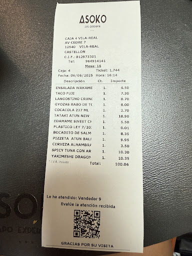 Read moreWe used to like ASOKO villareal 2nd to our favorite. ASOKO VIÑAROZ. Its the best. Unfortunately its our Third or 4th time here in Villareal and we didnt enjoy it. The waitress is rude. Becasue we complain about our food. Its not our first time so we know what we want and what our orders are We even heard them talking in the kitchen and her tone of voice is rude talking to his co worker about our complain. I find it upleasant and we are not coming back here anymore. We prefer to travel almodt teo hours atleast we know the service abd the food are all worth it. And apart from that since she work alone obviously we wait a little longer. All in all a not so good experience and is not worth the...