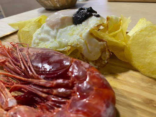 Per últim parlar-vos de les croquetes que són d'evolució i tónica canviant (hui per exemple en tenia de pernil ibèric, de gamba roja i de xipiró amb allets tendres) i el últim plat que m'ha oferit hui, una gamba roja de més de 100g acompanyada de tofona negra (tuber melanosporum), ou de corral i patates xip, una autèntica festa per al paladar!