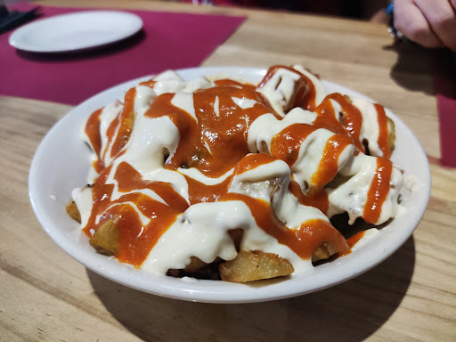 Como entrantes hemos probado las bravas y los nachos. En cuanto a las patatas, son muy similares a las de Memoriam Sport, que nos traen muy buenos recuerdos especialmente por la abundante y rica salsa. Respecto a los nachos, en Gastro Okei Herrialde se presentan de forma diferente: los tradicionales totopos a un lado y una salsa de queso cheddar con bacon en su fondo al otro, una original propuesta aunque a nosotros nos gusta más todo unido en un mismo plato.