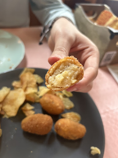 Read moreLo primero de todo, nos sentaron en un salón muy pequeño para tantas mesas con poca separación una con otra, poca intimidad e incómodo en general. De la comida se salvan 2 platos de 6 que hemos pedido. Las croquetas, como veis en la imagen, muy harinosas, platos que llegaban a la mesa sin cumplir con la descripción en la carta como la ensaladilla de remolacha y el bollito de costilla confitada. Lo único que se salva es el flamenquín que estaba muy bueno y los fideos tostados con alioli y langostinos. Esto es lo que pedimos para dos personas y nos quedamos con algo de hambre. Sinceramente, no se puede juzgar a un restaurante por 6 platos pero también hay que decir que no se puede pagar con tarjeta y hay que hacer un bizum en su lugar, lo que nos pareció muy raro para ser un RESTAURANTE. El precio en general es barato pero la calidad deja mucho que desear, no sé...