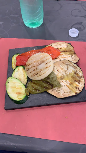 Se lo digo, y se la llevan (un poco poniendo mala cara), junto con los platos de la paella, y un rato más largo vuelven a salir, esta vez con la hamburguesa de pollo... y tengo que volver a levantarme otra vez para pedirles que nos pongan platos y cubiertos... nos ponen un plato DE POSTRE (se ve en la foto, el que está más lejos de mí).