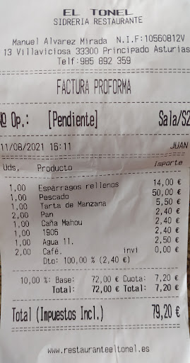 Pagamos unos 80 euros (poco màs) por los dos salmonetes, el entrante, un agua y dos botellas de sidra DOP.