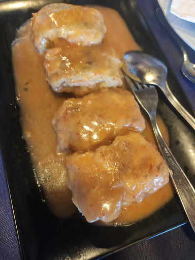 Vamos pues al lío. Pote asturiano, que aquí hacen con nabiza y no con berza, como parece ser más habitual. Extraordinario. Todo lo que os diga es poco. Pleno de sabor, si bien fino y suave. Ración tradicional también. Esto es, te traen la cacerola para varios vuelcos muy generosos a tu criterio. En plato aparte el compango, que aquí consta de chorizo, morcilla, oreja y costilla (de las güenas, en las que el palo sólo sostiene una cantidad de carne muy significativa) y el sorprendente concurso del chosco de Tineo 😍 Lo dicho: Extraordinario pote asturiano. Sigo con más tradición: Rollo de bonito. Generoso plato, de nuevo, de este riquísimo plato tradicional asturiano significado por el producto de temporada. ¡ La rebelión de la cocina frente a lo crudo ! ❤️ Acompañado, claro, con patatinas fritas. Para acabar dudaba entre un par de postres, y me ayudó el joven camarero, Santiago. Que es más majo que las pesetas y a todo quisque bien recomendaba y encaminaba. Opté, tras su consejo, por el riquísimo flan de castañas.