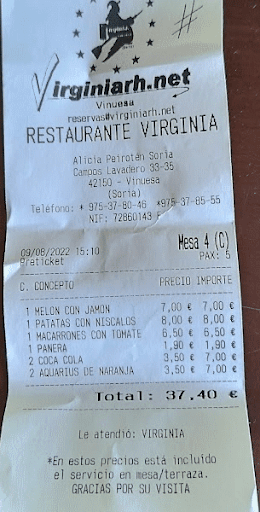 Read moreLo primero que nos dicen es que no hay torreznos. En un sitio donde el torrezno es religión, no hay. Mal empezamos. Lo segundo, tampoco tienen el vino que pedimos y nos ofrecen uno "equivalente" pero que no era crianza sino roble por el mismo precio. Lo indignante es cuando pedimos una ensalada DE pimientos rojos ventresca. Vamos a ver: si en la carta se lee "ensalada de pimientos rojos CON ventresca", uno espera que le saquen pimientos y ventresca. Pero lo que nos sacaron fue una ensalada ilustrada con muchísima lechuga decorada con cuatro lascas de ventresca y cuatro láminas de pimientos. 4 contadas. Adjunto foto. Eso no es ensalada DE pimientos con ventresca. Eso es una ensalada normal CON pimientos y ventresca, pocos, por cierto. Si hacemos un mal uso de las preposiciones, estamos transmitiendo un mensaje engañoso y engañando al cliente. (14,50€. Sin comentarios).Adjunto foto de la carta. No invento nada. Seguimos con una ración de queso trufado. Nos sacan 8 lonchas de queso casi transparentes. No pasaban de los dos milímetros de grosor. (13,50€. Sin comentarios) y una ración de jamón serrano muy seco y muy mal cortado. Dos euros más por dos trozos de pan. La bromita salió por casi 70€ entre dos personas y, obviamente, nos quedamos con mucha hambre. El tema de la ensalada, directamente es una estafa. Resulta sintomático cómo en el bar con terraza de enfrente, del otro lado de la carretera, estaban todas las mesas llenas y clientes haciendo fila esperando para que les asignasen mesa, mientras en este otro fue llegar y sentarse. Evidentemente, los clientes habituales ya saben a dónde no tienen que ir. No somos de Vinuesa pero ocasionalmente nos dejamos caer por allí. Nosotros hemos perdido 70€, ellos unos...