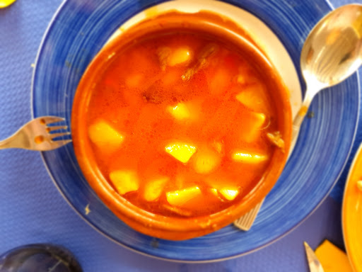 Pedimos 3 platos sueltos. Los macarrones, escasos, a 6.50€, y en otras fotos veo que vienen con queso rallado. Los nuestros no. El melón con jamón (7.00€) dos cortes de 1 cm de ancho y dos lonchas de jamón que deja pasar la luz (muy fino). Patatas con niscalos, pues un guiso con dos ingredientes y especiado.