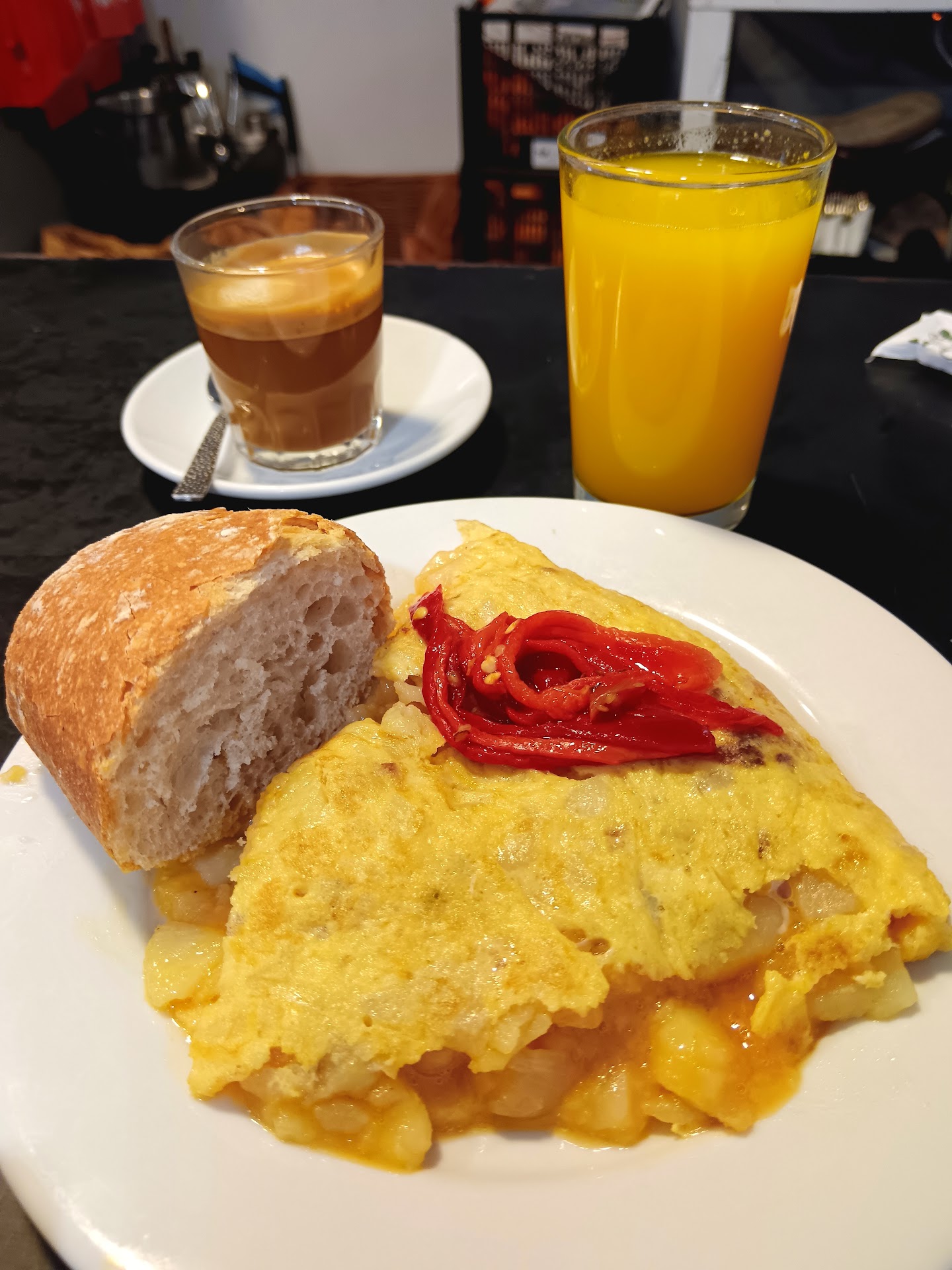 Y la tortilla... buenísima, con una ración más que generosa, alguna patatita morena (me encanta) y ligero aporte de pimiento verde. Allí cayeron dos, y otra que me lleve para el camino