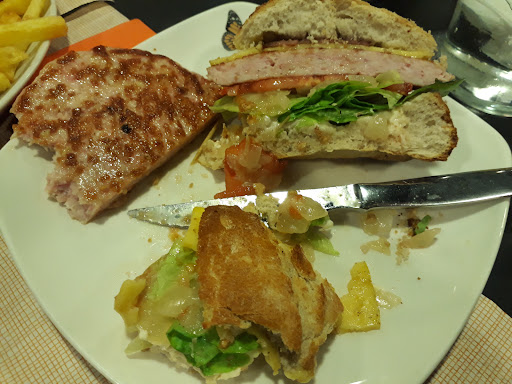 We are staying at the Holiday Inn Express and as the Hotel is in what seems to be a recently new industrial estate the only option here for local walkable eats was the restaurant/cafe Aldaia, unless you can be bothered driving into town but it took us 10 hours to get here so we were in no hurry to drive any more. The bar is large and very nice however they must have had a busy lunch period because there was lots of bits of rubbish on the floor at our feet, we were on bar stools at the bar, while we were there it was starting to get busy and there was only one woman working in the bar , she spent most of her time on the phone but was quite efficient at serving while on the phone. We ate here and I enjoyed the food, the food I ordered from the English menu was not what I expected, I ordered a number 75 which you will see from the photos is described as similar to Black Pudding , what came was nothing like black pudding it was more like a minute steak, I did enjoy the meal, I think the incorrect description was probably just a translation mistake as they have the menus in English as well as French which was a nice touch, all in all it was a reasonable meal, the bread basket they gave us looked nice but the bread was as hard as a brick, so we refused to pay for it. I gave this place a 3 star as it was a satisfactory establishment nothing special and in the middle of an industrial area. As we missed breakfast in the Holiday Inn Express the next day we came here for breakfast there were 2 servers this time and breakfast was really nice, coffee was good.