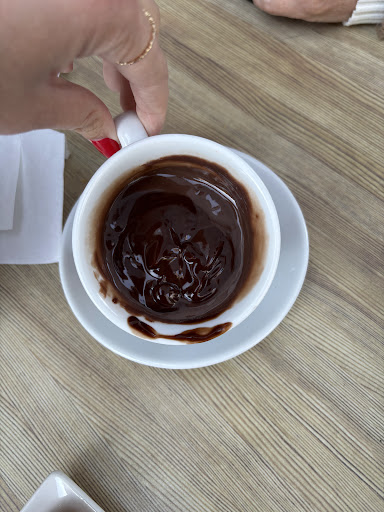 El chocolate lo habían hecho con una hormigonera, si le doy la vuelta a la taza no cae. Debe ser la amalgama con la que se construyó la catedral nueva. La densidad del chocolate es superior a la manteca de cerdo, han tardado 40 minutos en sacar dos chocolates a la taza que literalmente ha sacado de un tetrabrick. El fisioterapeuta ha diagnosticado codo de tenista a mi tía abuela porque se ha lesionado revolviéndolo.