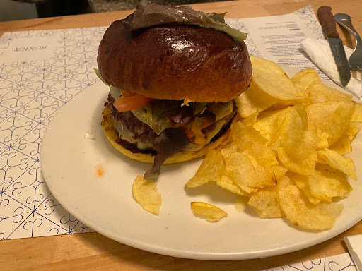 Nos sirven la comanda y justo cuando hemos hincado el diente a la hamburguesa viene otro chico, que creo que será el dueño, y nos dice: "se lo estamos diciendo a todos los dueños de perro, que cuando vengais a cenar vengais sin perro o os quedeis en la terraza".
