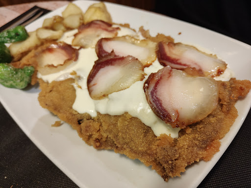 Decidimos reservar allí por las reseñas que le pone la gente. Antes estaban en el centro de Vitoria y ahora se han cambiado de local a la zona de ibaiondo, y allí que fuimos. Noche de Halloween 2024. 8 adultos y 5 niñ@s. Se reservó con antelación suficiente dejando una fianza de 10 euros por persona. Pedimos unos sándwich de jamón serrano y patatas para los niñ@s y varios cachopos para los adultos. Nos sentamos los primeros a la mesa y he de decir que no tardaron casi nada en preparar la cena y la pinta a primera vista espectacular. Cual fue nuestra sorpresa al partirlos y darles el primer bocado? Que allí no había filete de ternera por ningún lado. Jamón serrano, queso y un buen empanado. Vamos lo que viene siendo un San Jacobo de toda la vida. Que yo sepa el cachopo consta de dos filetes de ternera de buen tamaño uno encima del otro y en medio se rellena con jamón, queso y lo que le quieras meter. Y todo esto se empana de una tirada.