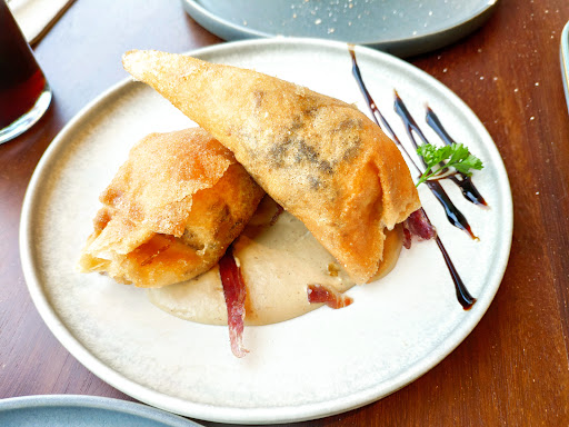 A continuación llegó la recomendación que me hizo el camarero que me atendió y al que agradezco la sugerencia (no os imaginais cuanto! 🤤): normalmente no lo hubiera pedido y me lo hubiera perdido! Se trata del Crujiente de setas con salsa de hongos y foie, con virutas de ibérico. La presentación del plato ya te indica que ahí hay algo bueno de verdad... y cuando rompes el crujiente.... sorpresa! No os lo cuento para que lo descubráis vosotros mismos