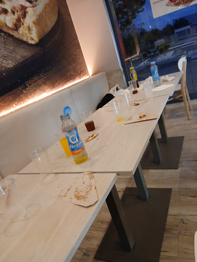 El chico de la caja nos cobra la botella de agua grande y nos da una pequeña. Pedimos dos pizzas para comer allí, nos las da sin cortar. Al pedirle que nos las corte nos pregunta, a pero las queríais cortadas? Y como nos las comemos sino... Las pizzas peor de sabor que nunca. La mujer que las prepara está manipulando la masa y los ingredientes sin guantes, vemos cómo sale a la caja y se pone a tocar monedas para acto seguido seguir manipulando la comida sin guantes ni haberse lavado las manos previamente. Lamentable en todos los aspectos. Ha bajado mucho la calidad y profesionalidad de Telepizza, al menos en este local. Nada recomendable venir aquí. Siempre me ha encantado Telepizza pero ese día salí totalmente decepcionado tanto con el producto como con la atención y profesionalidad con la que nos atendieron. Más valdría que taparan la zona de preparación de pizzas. Hay un cartel que dice, mira como la preparan o algo asi. Si ves lo que pasa en la cocina se te quitan las ganas de comer allí. Le doy una estrella porque no se...