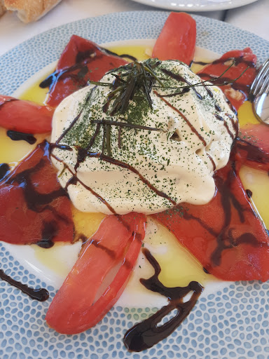 We sat outside during high summer heat which I would not recommend. Inside it looked nice so if you go for lunch on a hot day ask for a table inside! Things to know about the menu is that they don't offer any chicken dishes and there are hardly no vegetarian options. If you ask for something that sounds vegetarian make sure to specify you don't want any bacon bits or anything meaty on the dish!! The food overall was good, but on some dishes they really overdo it with the mayo (see pic...). The service was a pass, no extra mile here. Overall a bit pricey for...