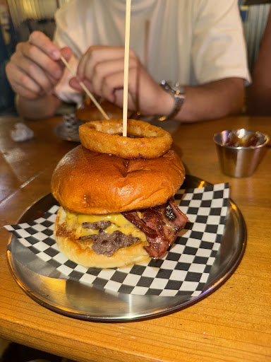 Read moreFuimos a cenar el lunes 16/08, llegamos sobre las 21h y pico porque supusimos que estaria concurrido, como así fue. La espera a que quedara una mesa libre no fue demasiada y el personal fue muy amable. Pedimos la bebida, unos aros de cebolla y dos hamburguesas. Ibamos con mi hijo de 14 meses y fue complicado entretenerle durante los 45' que tardaron en llegar los aros y los 50' de la hamburguesas, me pedí en la espera una caña y un doble, que con el estómago vacío y el tiempo de espera cayeron regular. Las hamburguesas estaban buenas, los 8 aros de cebolla por 6€, estaban correctos. Me da pena dar una valoración de 1 estrella porque el personal fue amable y atento y la comida no es mala, pero es que el tiempo de espera desespera a cualquiera y más con un niño tan pequeñito. Lamentablemente no volveremos más.
