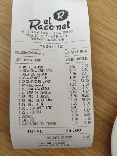 Me llamó la atención que pedimos dos Coca- Colas zero y nos las pusieron de lata (330ml) cuando la mayoría de mesas, por no decir casi todas) las tenían de cristal (350ml). Otro detalle que no me gustó es que cuando pedías la bebida, a unas mesas les ponían un platito de patatas fritas para acompañar y a otros no (a nosotros no...)