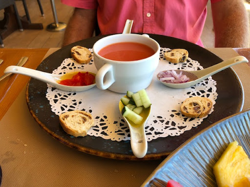 Read moreAs it was so hot we didn't have the meat or fish dishes that would have demonstrated the chefs' abilities. I had the prawn and avocado salad and my husband chose gazpacho and then chicken and pineapple salad with honey and mustard dressing, which he enjoyed. Nice waiter, slightly surly guy on reception duty, we had booked but who knows if we were on the list! It is a big place, so there are lots of tables. They were all a bit too close together for my liking, so it felt like being in a railway carriage, with waiters passing on either side of us. But I suppose they have to squeeze in as many covers as possible after the past two challenging years. As it is on the Arenal, prices are a little high for some things, for example 1.20 each for a bread roll, but of course, all restaurants are experiencing price increases for ingredients and gas/electricity. I think our salads were 11E and 9E and the gazpacho 7E, which was a bit steep given it was a small portion and no better than what you can buy in a carton at the supermarket. But overall it was a nice lunch and we...