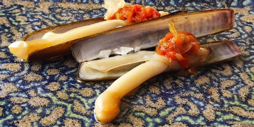 Nuestra comida fue un verdadero viaje de sensaciones. Arrancamos con una navaja con pisto y panceta ibérica, delicada pero con carácter, donde la suavidad marina se encontraba con la intensidad de la tierra. Después llegó la gamba roja de Jávea a la brasa, ese tesoro que guarda la bahía y que aquí tratan con el respeto que merece: jugosa, pura, de sabor limpio e inolvidable. El broche lo puso un arroz meloso con bogavante azul, cremoso, elegante, con ese punto exacto que te hace cerrar los ojos y sonreír porque sabes que estás ante algo especial.