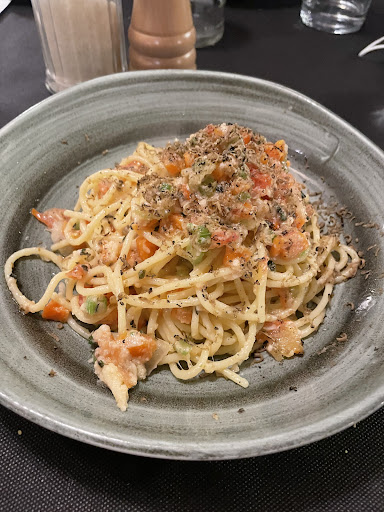 The sea food linguini tasted nothing more than salt, pasta was not al dente and didn't even taste like home made pasta nor italian "good" pasta. When they came with the Carbonara i immediately saw that they had no idea what they were doing in the kitchen. It was white and runny, so I would guess it was cream based. A real carbonara is yellow! Since it only has egg yolks, pecorino, and the water from the pasta - which should create an "emulsion". If it's runny there's no emulsion, and you're using the wrong ingredients. I'm guessing the chef in the kitchen doesn't even know what an emulsion is. Which is nothing more than just sad. The mozzarella pastas where quite tasteless and really nothing special.