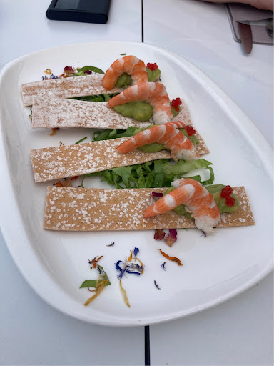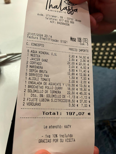 Fui a cenar con cuatro amigos y pedimos entrantes, vino y un plato principal por persona. La lubina nos sorprendió por su pequeño tamaño, muy por debajo de nuestras expectativas considerando su precio. La brocheta fue aún peor, con un precio de 18,5 € por dos brochetas poco contundentes, cada una de menos de 15 cm.