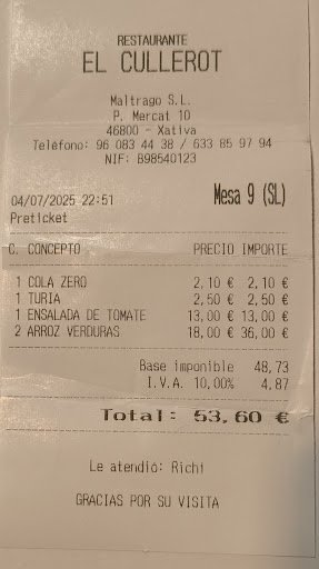 Read moreA ver... Respecto al comentario de Agustín, más abajo expuesto recientemente, y respondido por el propietario del local, donde este último da por sentado que fuimos allí a montar jaleo e incordiar a las mesas vecinas (?), tengo que decir que no creo en segundas oportunidades y más aún en este tipo de establecimientos... De echo, esta era la segunda de una primera que, aunque de forma distinta, no fue mucho mejor. Una vez leído dicho comentario, donde creo que no se ha dicho todo lo ocurrido, debo añadir: El domingo pasado (29-09-24), nos tuvimos que marchar sin comer y con una botella de vino debajo del brazo que, por ser demasiado correctos, paguemos. Como estaba diciendo, fue poco después de destapar el vino, cuando, el camarero nos trajo las cartas, nos dejó claro que no quedaban algunas cosas de la misma y ante nuestra decepción (estupor sería más exacto), nos explicó lo del evento de Xativa al Paladar... Que estaba caducado y que también, (esto tiene bemoles), en ese mismo día se celebraba la Carrera contra el Cáncer.... Alucinante... Ni que fueramos retrasados... Que tendrá que ver una cosa con la otra !!!!... Yo le podría haber contestado que "mi abuela tenía una bicicleta". En fin... Mejor dejarlo aquí. Ya se que no os hacen falta clientes A nosotros también nos sobran restaurantes. Eso si: habéis tenido muy poco tacto. Por lo menos con...