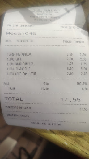 Read moreUn supuesto almuerzo especial por 8,50 €: unas tostadas con queso de loncha, agua (1 compartida para dos almuerzos). Como no tomo café y pido un colacao, me cobran a éste a parte, 1,70€, porque dicen que el colacao no ha sido para mí sino para un niño (mis dos hijos han tomado dos zumos). Ahora veo en su carta que precio del supuesto almuerzo especial son 6 euros, los 2,50 restantes ¿serán por los cacahuetes y las aceitunas que han puesto en medio para compartir entre 3 personas, (que sumaria en total 7,50)? O quizá los 2,50 serán por haberme tenido que servir la leche por segunda vez natural como la había pedido en lugar de hirviendo como me la han servido? Finalmente y de malas maneras me ha devuelto el 1,70 del colacao que ‘no tomamos los adultos’. Habitualmente, cuando voy a un lugar en el que no me siento bien tratada o no quedo satisfecha con la comida, me basta con no volver, pero en este caso me parece que lo justo es publicar lo malísima que ha sido la experiencia, especialmente por el trato que se nos ha dado a la hora de pagar, de pedir un justificante, y reclamar lo que no tiene ningún sentido, además de ver ahora que ademas nos han cobrado lo que han,...