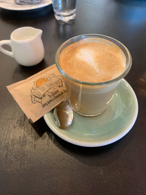Coffee only review. Spotted another sign that promised good coffee. On the window it reads, Freshly Roasted Beans. This made my coffee lovers heart beat faster. Here’s my two cents. I am not sure this place is new, but service was a bit off. We waited a long time before somebody came over to take our order. The table setting is off an uncomfortable. There are big round tables that take up a lot of space. We ordered caffe con leche, and flat whites (yes they have flat white on the menu). First impressions, I thought the coffee was not going to be good as it looked very milky. But(!), it really had a great taste. The taste was dark, with a slight hazelnut aftertaste, very pleasant. No acid fruity aftertaste. Prices of the coffee are “high” compared to other places in the area. For a cortado - two cafes further you’d pay € 1,15. Here the flat white was €2,60. Still not regular big city coffee prices but higher than you may expect. It’s true, there was a bit too much milk in the flat white but overall I’d score the coffee a 7 out of 10. We didn’t taste the food or cakes. End score, good neighborhood coffee for the...