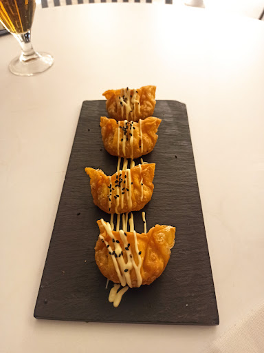 Nosotros pedimos Gyozas (increíble); batatas con pulled pork (mejor entrante que he probado en esta playa) y los langostinos (riquísimos también).